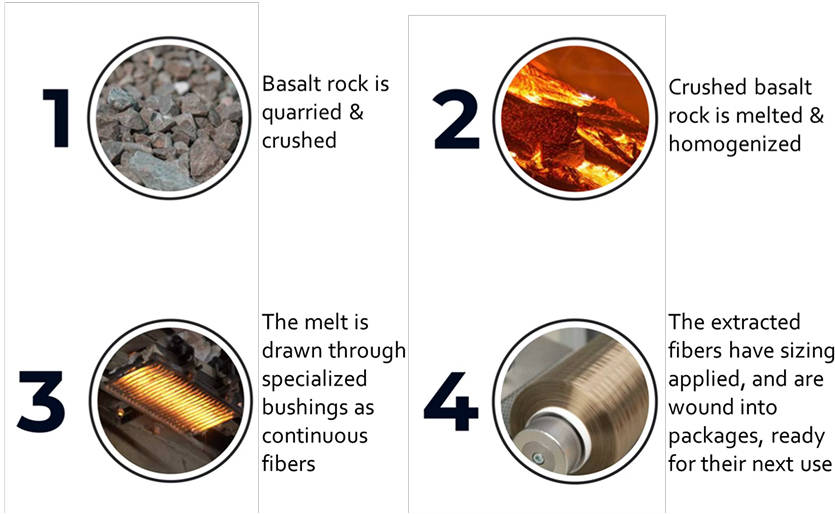 Basalt Fiber is produced from crushed basalt sourced from a carefully chosen quarry. Unlike materials such as glass fiber, it contains virtually no additives. The basalt is washed before being melted down. Producing basalt fiber involves melting the quarried basalt rock. The molten rock is extruded through small nozzles to create continuous filaments of basalt fiber. These fibers typically have a filament diameter ranging from 9 to 17 microns, and they exhibit a high elastic modulus, resulting in exceptional specific strength that is three to four times that of steel.